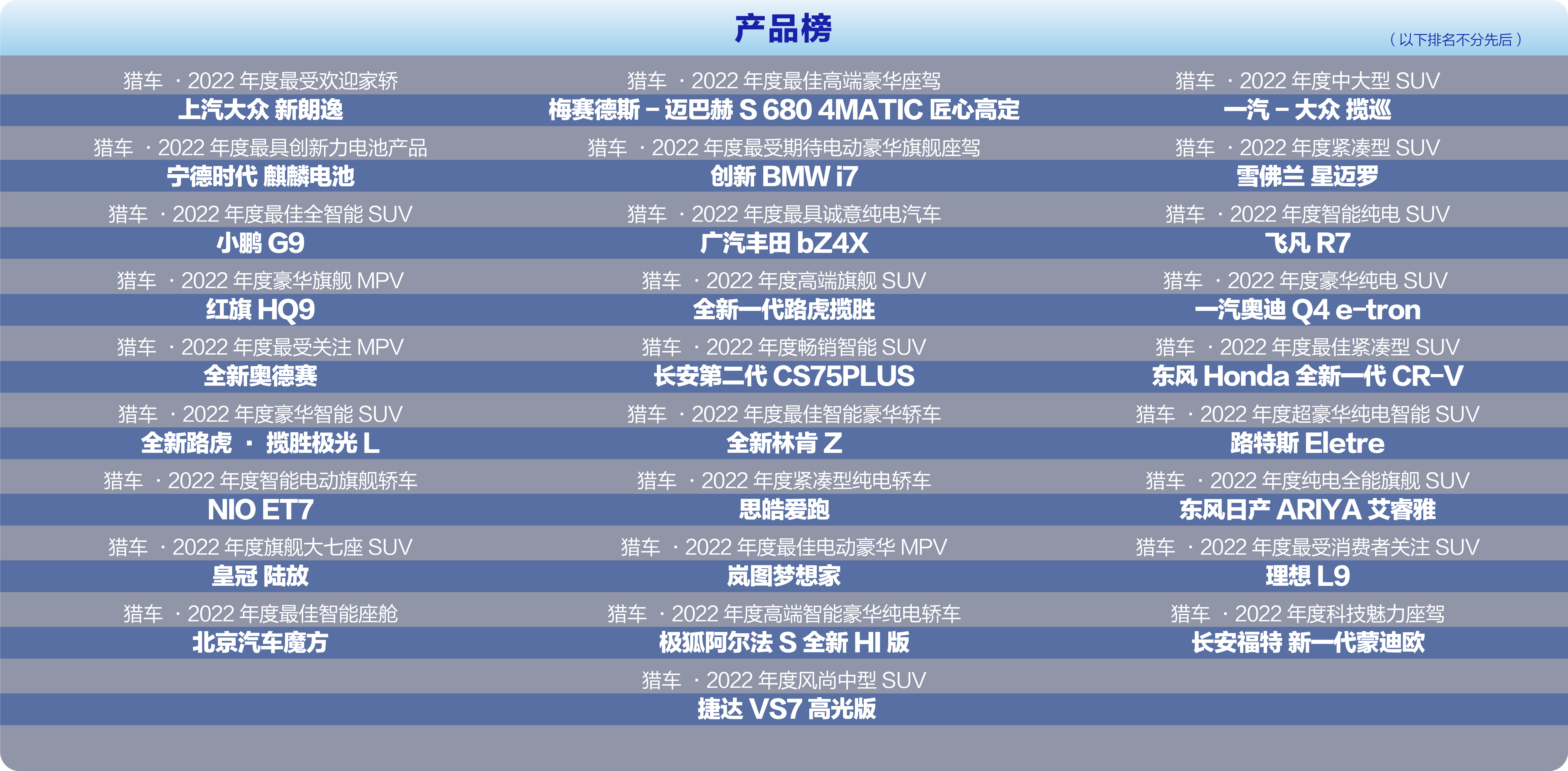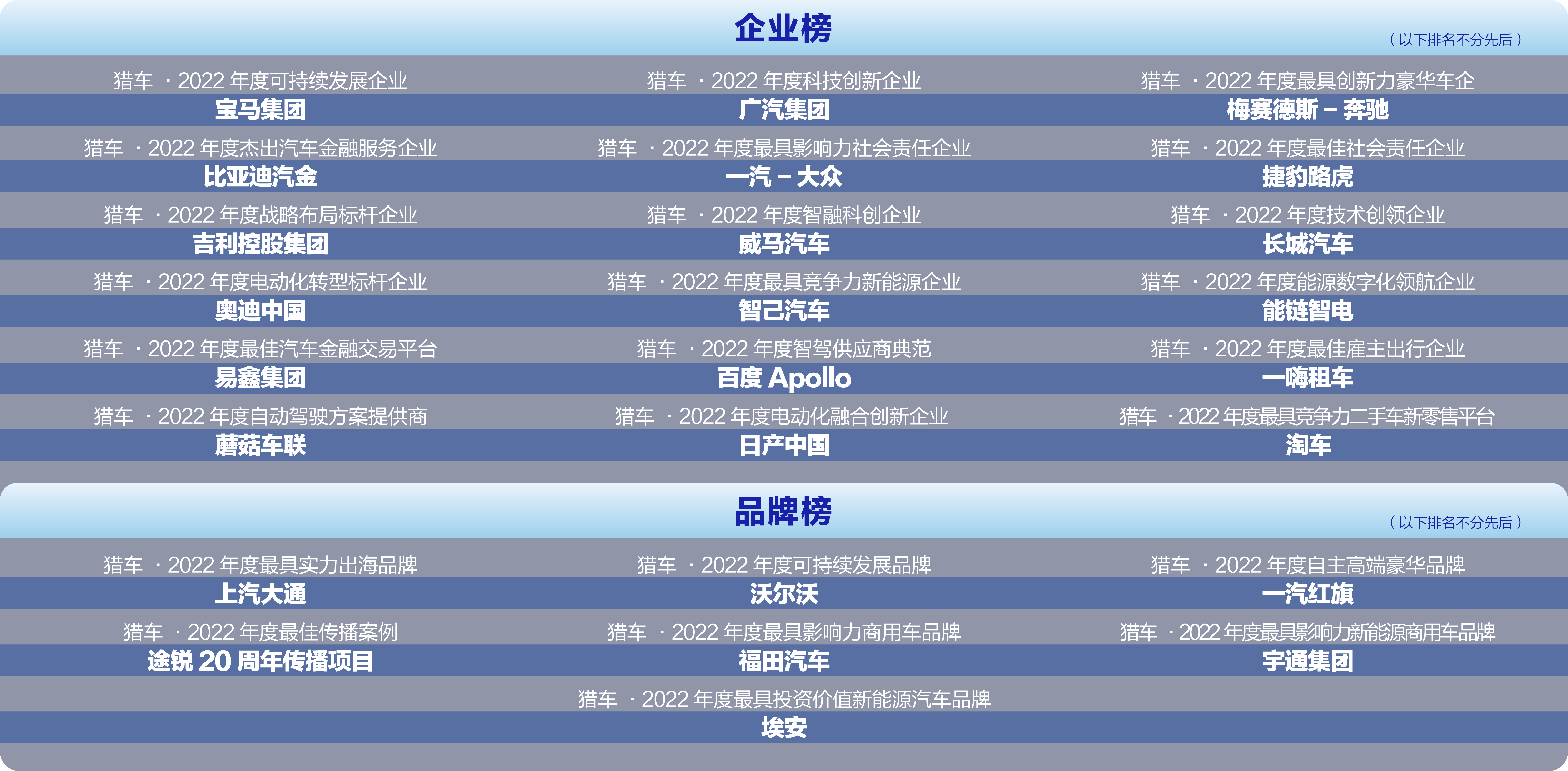 “中國獵車榜” 由每日經(jīng)濟新聞于2008年正式發(fā)起,旨在作時代變局的見證者,汽車產(chǎn)業(yè)革新的推動力。 十余年來,中國獵車榜始終堅持“公開、公平、公正”的原則募集獎項申請,組織行業(yè)專家和知名媒體人進行集中評審,全面覆蓋整車企業(yè)及產(chǎn)業(yè)鏈上下游企業(yè),獲得了行業(yè)同仁的認可和大力支持,如今,中國獵車榜已成為行業(yè)最具權威和影響力的獎項評選之一。 基于此, 《每日經(jīng)濟新聞》 將于2022年11月23日在線上舉辦以 “向新而生 創(chuàng)享末來”為主題的第十四屆中國獵車榜,與行業(yè)專家、高校學者、企業(yè)高管相聚云端,共話未來!